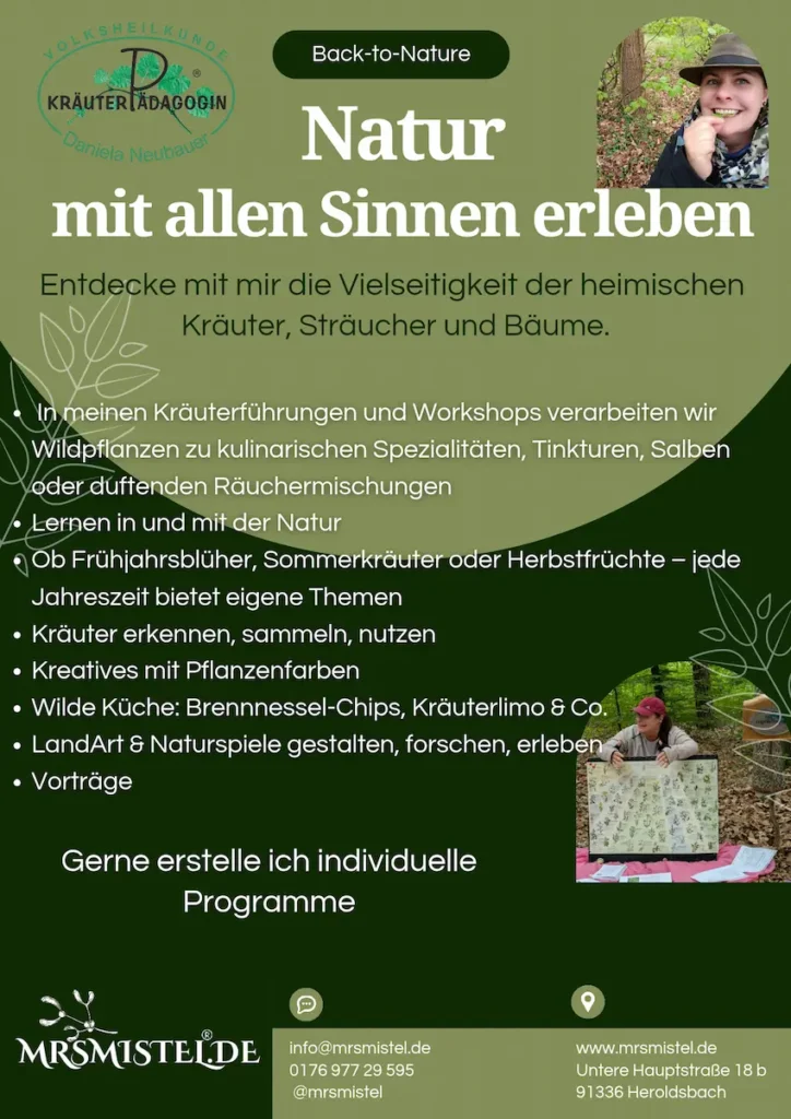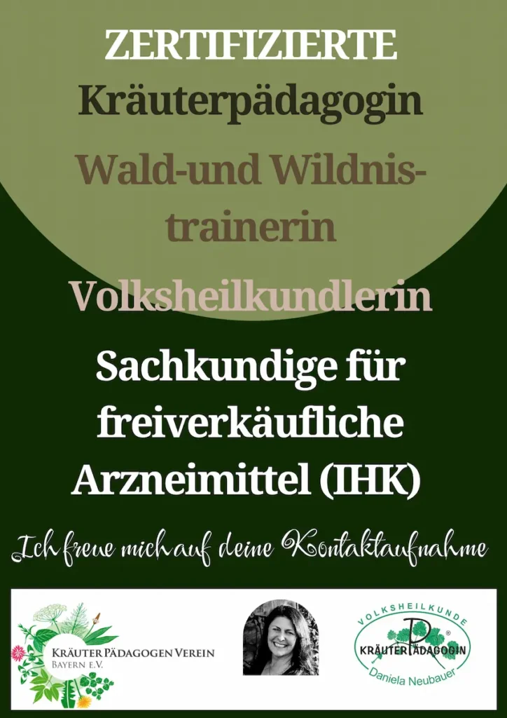 Als selbständige Kräuterpädagogin vermittelt Daniela Neubauer mit großer Leidenschaft in Workshops, Führungen und Wanderungen Wissen über die faszinierende Welt der Pflanzen – humorvoll, locker und mit viel Herz.